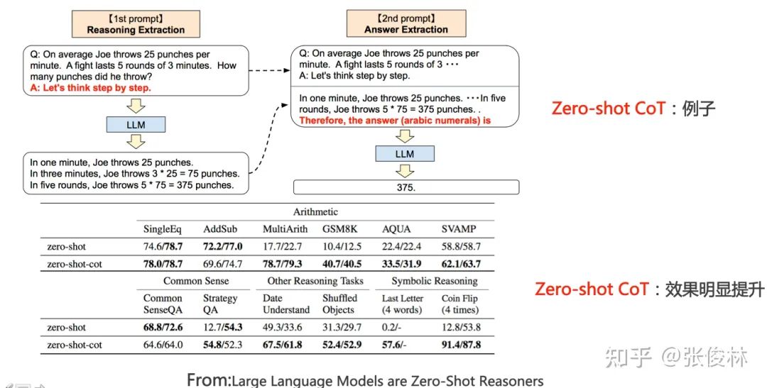 第二种思路一般被称为基于示例的思维链(few-shot CoT,Chain of Thought)Prompting。这个方向目前是LLM推理研究的主方向,很多工作都是在这个思路上做的,我们简单介绍几个效果显著的代表性工作,基本能代表CoT的技术发展方向。