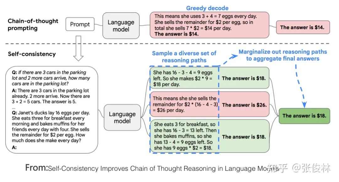 CoT提出不久,很快在22年3月份,一项被称为“Self-Consistency”的改进技术就将GSM8K测试集准确率提高到74.4%,提出这项改进的论文是“Self-Consistency Improves Chain of Thought Reasoning in Language Models”。“Self-Consistency”的思路也很直观(参考上图):首先可以利用CoT给出几个写了推理过程的示例,然后要求LLM对给定的问题进行推理,如果是CoT,直接输出一个推理过程和答案,整个过程就结束了。“Self-Consistency”则不然,它要求LLM输出多个不同的推理过程和答案,然后采用投票的方式选出最佳答案,思路非常简单直接,但是效果也确实好。“Self-Consistency”其实是教导LLM学会这么一个道理:孔乙己说过茴香豆的“茴”字有四种写法,类似的,一个数学题的正确解法也可以有很多种,每个不同的推导过程都指向最终的答案。条条大路通罗马,虽说也有个别迷路走到北京的,但是迷路的毕竟是少数,看看大多数人走到哪里,哪里就是正确答案。简单的方法往往蕴含着深刻的哲学含义,是不是这道理?