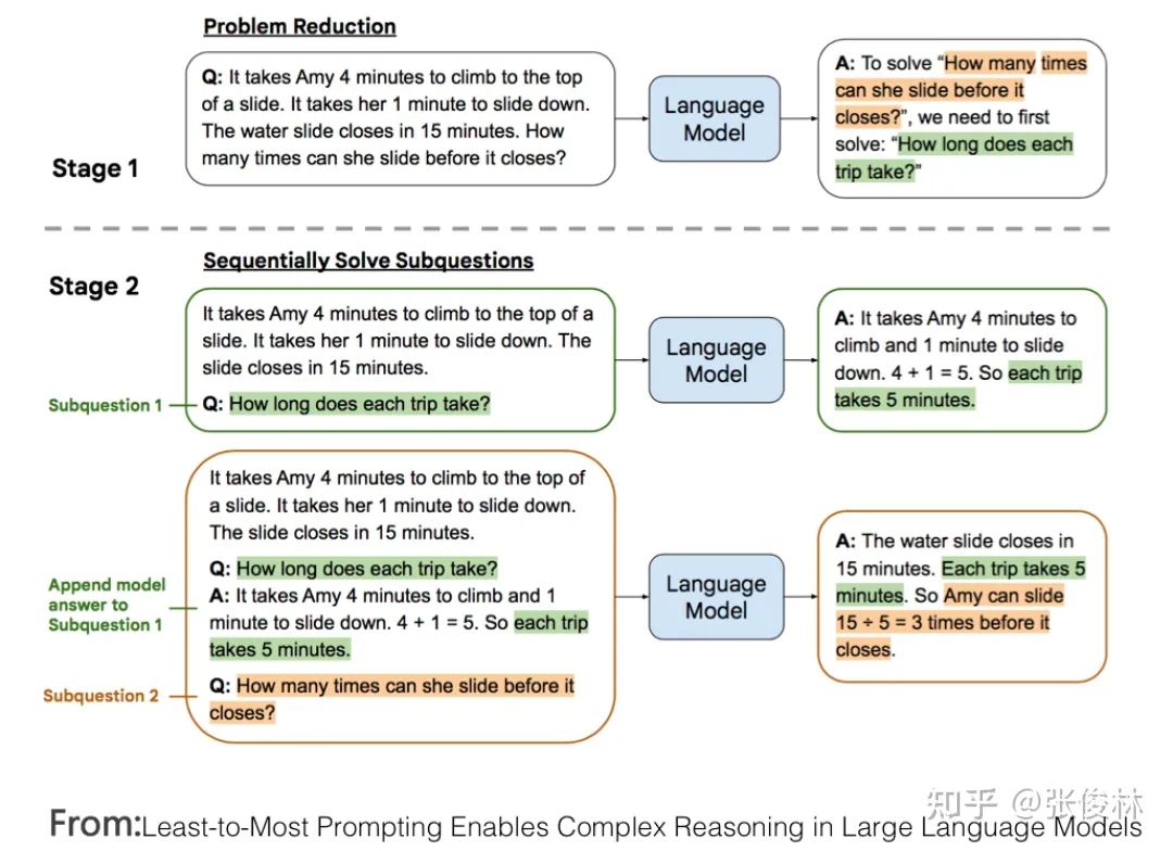 我们以“Least-to-most prompting”技术为例来说明这种思路的一种具体实现方式,如上图所示:它分为两个阶段,第一个阶段,从原始问题我们可以得知最终要问的问题是什么,我们假设最终问题是Final Q,然后从原始问题填充Prompt模版:“如果要解决Final Q问题,那么我需要先解决”,然后把原始问题和这个Prompt交给LLM,让LLM模型给出答案,等于让LLM给出最终问题的前置子问题Sub Q;接下来我们进入第二个阶段,让LLM先回答刚才拿到的子问题Sub Q,并拿到对应的答案,然后原始问题拼接子问题Sub Q及对应答案,再去问LLM最终那个问题Final Q,此时LLM会给出最后的答案。如此这般,体现出拆解子问题,并从子问题的答案逐步找出最终答案的思路。