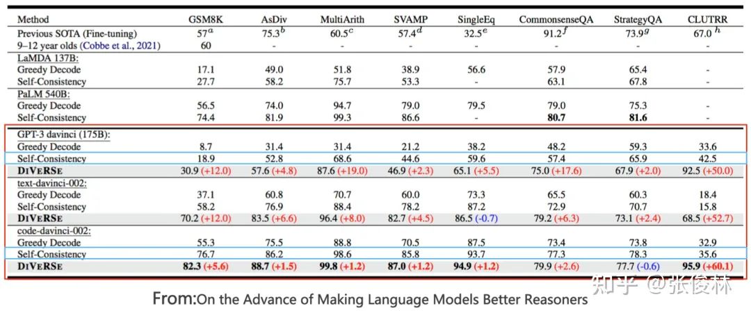 除了这个现象,从上图数据中,我们还可以得出其它一些结论,比如GPT 3这种纯文本预训练模型,其实是具备相当程度的推理能力的,除了在GSM8K这种数学推理上效果比较差外,其它推理数据数据集合表现也还可以,前提你需要采用合适的方法,来激发出它本身就具备的这种能力;再比如,text-davinci-002,也就是在code-davinci-002基础上加入instruct fine-tuning后的模型(就是加入InstructGPT或ChatGPT模型的第一步),其推理能力要弱于Codex,但是有其它研究表明它在自然语言处理任务又要强于Codex。而这貌似说明了,加入instruct fine-tuning,会损害LLM模型的推理能力,但是会在一定程度上提升自然语言理解能力。而这些结论其实都是很有意思的,也能启发后续进一步的思考和探索。