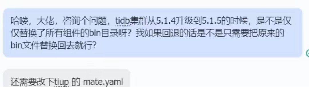 PingCAP原厂并没有提供回退集群版本的明确方式,正常在TIDB集群进行升级操作前,会停机将集群里面的数据进行一次全备,防止集群在升级过程中出现未知的错误,并且无法解决。灾难发生时,会重新建一套升级前版本的集群,然后将升级前全备的数据重新导入来实现集群的回退效果。