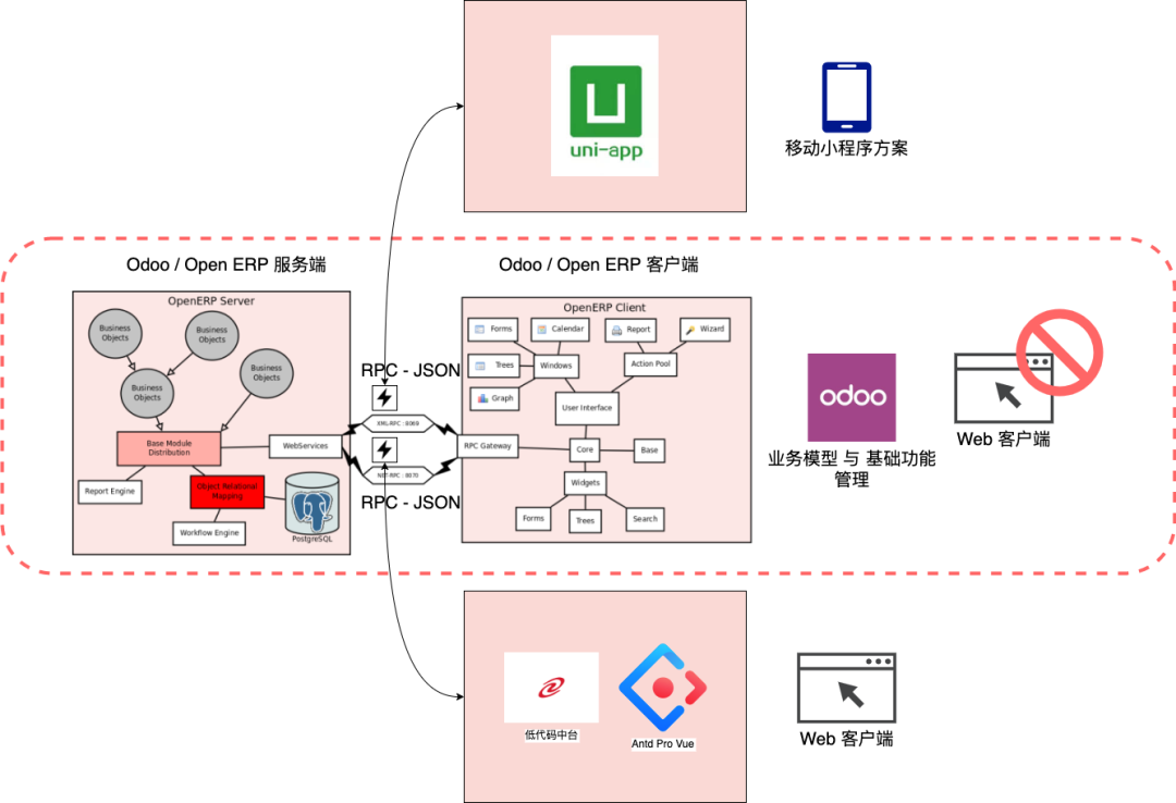 下图中虚线内Odoo 与虚线外的自定义客户端通过 Odoo RPC 风格接口进行通信。
