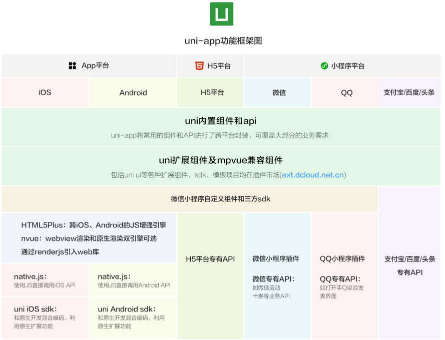 uni-app 已将常用的组件、JS API 封装到框架中,开发者按照 uni-app 规范开发即可保证多平台兼容,大部分业务均可直接满足。