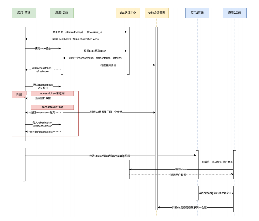 Step 6:应⽤1后端在redis上构建⼀个全局会话(redis中通过随机⽣成的key值sid来表示),将AccessToken,RefreshToken,和IdToken存⼊全局会话,并⽣成应⽤1的局部认证⽅式(这⾥采⽤AccessToken1和RefreshToken1)返回到应⽤1前端;