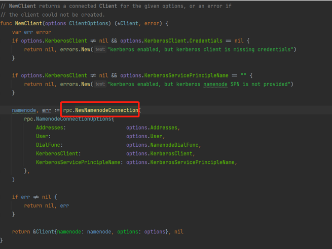 通过查看HDFS包的代码,可以发现HDFS包连接HDFS服务的方式,是通过RPC的方式来连接Hadoop HDFS 的Namenode的。