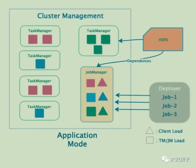 会话模式 和 per-job 模式下面,都是先将对应的 jar 在 client 进行解析,然后提交到 JobManager 上面。生成 JobGraph 的过程很消耗 CPU 资源,而且在多个 JAR 进行排队提交的时候,有可能会造成阻塞。在Aplication mode 下面,客户端 只是负责命令和接收结果,从解析过程开始之后就是放在 JM 上面运行。可以自己去指定划分 application,每一个 application 之中都有很多 job。dependency jar 可以由 jobManager 上传到 文件系统上如HDFS上,运行模式如下: