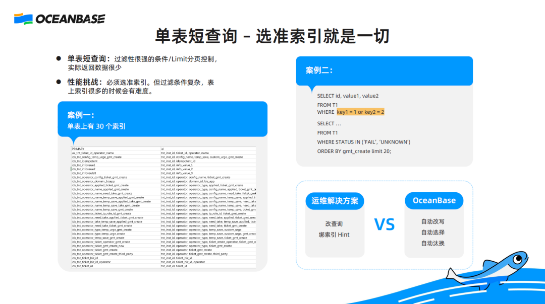 这些年,我服务于 OceanBase,观察蚂蚁的业务使用方式,发现绝大多数互联网 SQL 对数据库发起的请求都是单表短查询,对单表短查询而言,关键点就一个:选准索引,索引选准了,基本所有问题就都解决了。