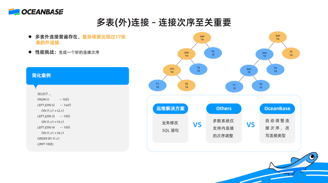 如今,OceanBase 实现了一套非常完备的连接枚举算法,可以调整内连接和外连接的次序,可以调整外连接、反连接、半连接,甚至还可以改变一个外连接的连接类型,把它变成内连接或反连接等,可以做到场景自动优化。