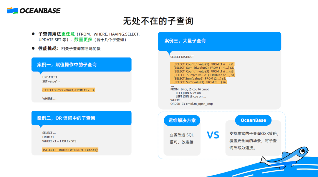 案例三还有一个比较有意思的点,这个场景里面写的 S1、S2、S3,这三个子查询结构是非常相同的,读的是一个表, WHERE 条件也一样,只是投影项计算的函数不同,对于 OceanBase 而言,把它变成连接后,还可以做一个更极端的优化,把三个子查询合成一个,这部分的计算直接由三倍变成一倍,性能会更好。