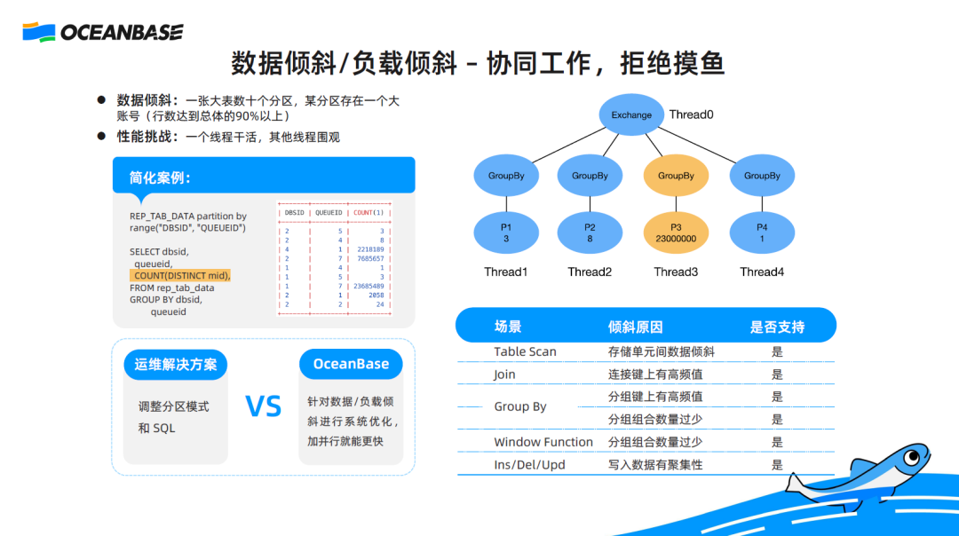 从运维去解决这个问题,我写了一条,调整分区模式和 SQL,理论上可行,但对每个场景的操作方法是不一样的,真正实操不太可行。真正要做的话,要从内核层面对数据倾斜、负载倾斜的场景做并行化算法的优化,要想办法把计算任务切细、切均匀,分散给每个线程,真正调用每个线程的能力,才可能把查询性能做得更快。