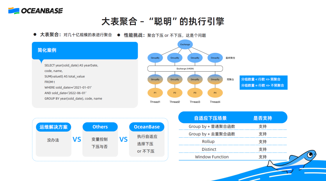 OceanBase 发现这个问题后,是让执行引擎变得更聪明,不在优化器层面去做决策,而是交给执行层,执行根据计算过程中的实际情况,去决定做不做预聚合优化, OceanBase 对各种场景基本都支持了,包括分组、去重、窗口函数。