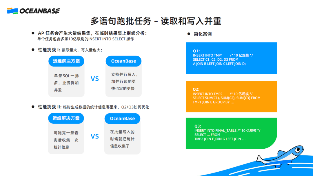 针对第一个挑战,读取量大、写入量大,OceanBase 从 3.X 版本开始,就已经支持并行化写入能力,多个线程一起往数据库里倒腾。