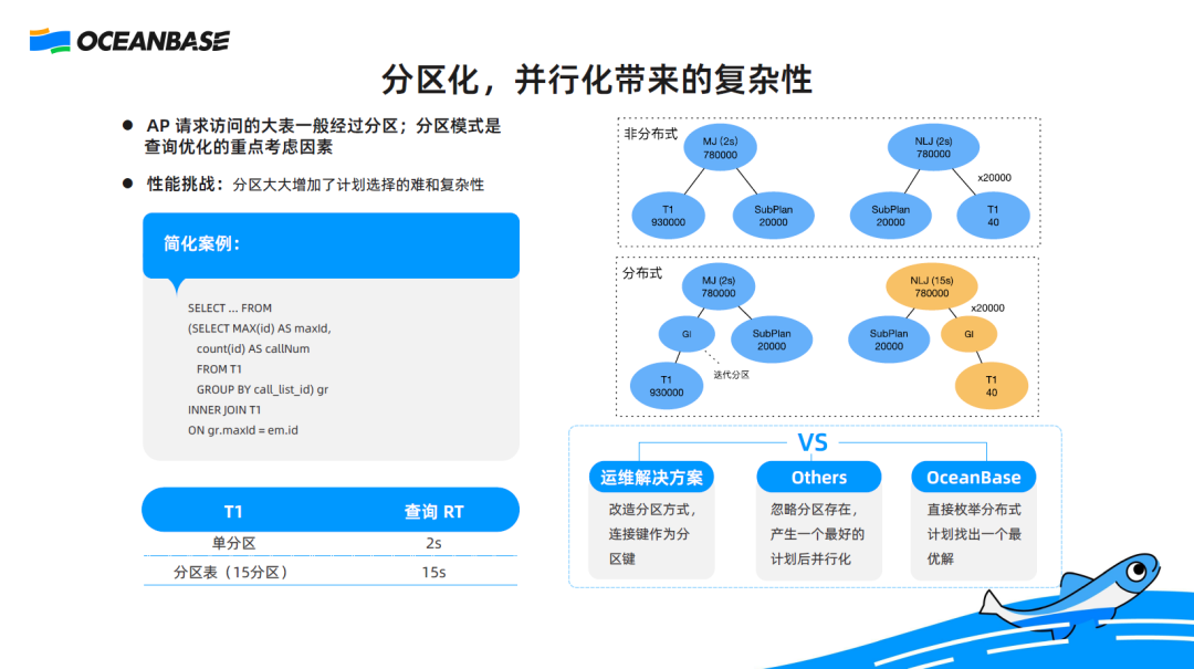 当我们去跑一些 AP 任务,很多时候表很大,会要求开一些并行,也会用多机模式,表也会是分区表,整个查询跑起来是并行化、分布式化的,所以面临的优化问题,不是在优化一个单机数据库上的串行计划,而是优化分布式场景下并行化的分布式计划,区别就是多了一个维度,数据是分区的,这会产生什么效果?执行计划会爆炸。