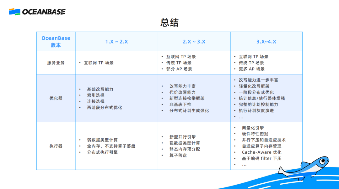 到了 3.X 和 4.X,从优化器的角度,一方面要去强化对 AP 场景的优化能力,另外一方面希望 TP 场景跑得更稳,让执行计划选得更准,所以我们做了一些特性,如执行计划的灰度演进,或者更强的 Hint 能力,可以让业务侧更好地控制优化器的执行计划;从执行引擎上而言就更多了,比如常见的向量化优化,硬件特性挖掘,更好的并行下压和自适应技术等。