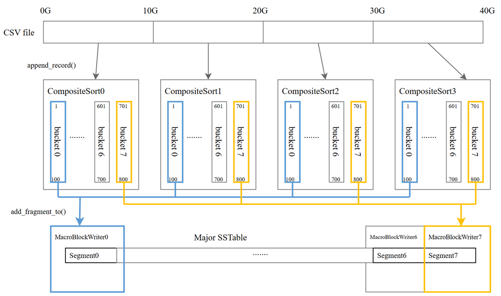 ObFragmentIterator各自集中到一起,例如将四个线程中负责0-100范围的集中到一起就能够获得0-100整体有序的数据,同样的再将其他三个范围的集中,那我们就能获得四个范围内有序,并且范围间有序的数据,然后四个线程各自取各自范围内的数据写 SSTable 就可以保证写的部分不重叠了。