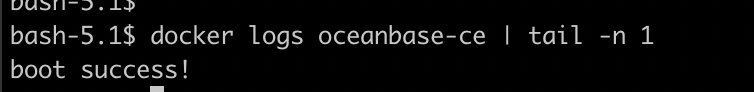 OceanBase 启动大约需要 2 分钟左右时间,当容器日志出现 boot success! 时,说明 OceanBase 已经启动成功。在 OceanBase 的 Docker 容器中还自带了常用的一些工具,在部署完之后可以直接用来做一些验证。使用以下命令可以使用 sys 租户连接到 OceanBase 数据库: