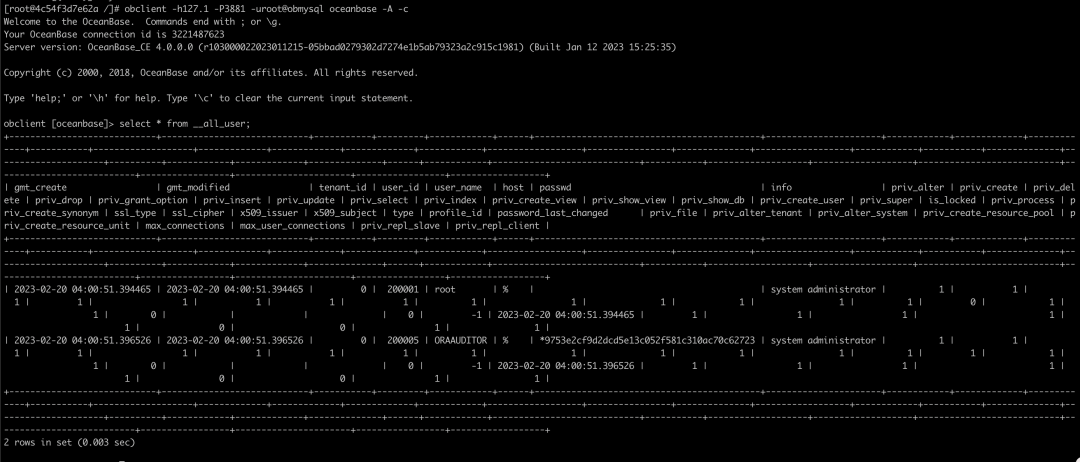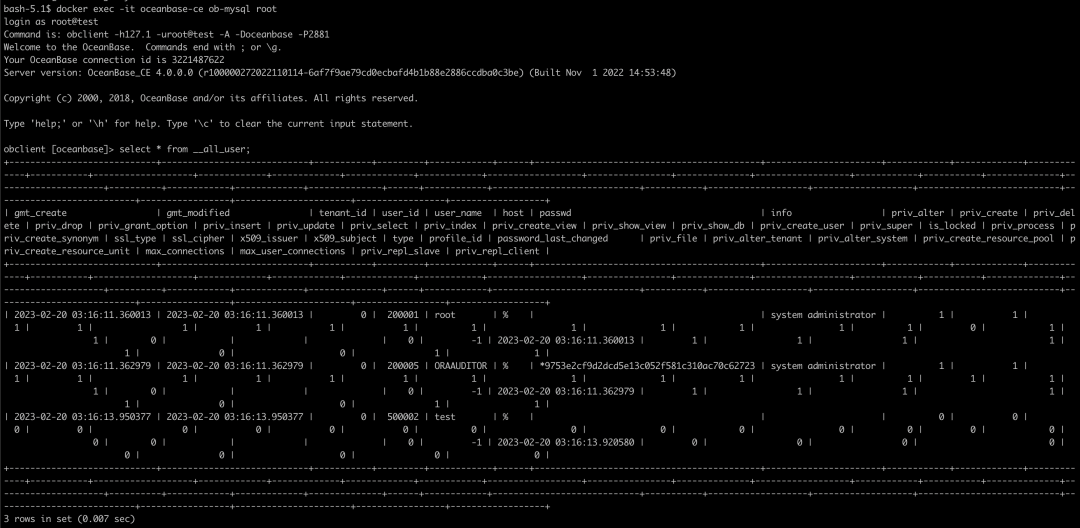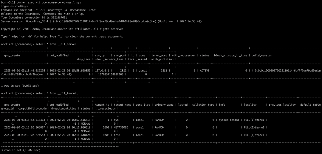 docker exec -it oceanbase-ce ob-mysql root # 使用 root 账号