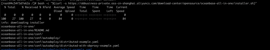 通过以上的步骤,现在我们已经成功的进入到了一个容器化的 Linux 环境中。OBD 可以直接以 rpm 包的方式安装,然后根据部署的配置,在线下载对应的 rpm 包,也可以通过 oceanbase-all-in-one 包的方式来安装,这种方式适用于网络不好的环境,会一起下载所有部署 OceanBase 需要的 rpm 包,本文以这种方式来进行安装。安装命令很简单,只需要一条命令,就可以下载并且安装好 oceanbase-all-in-one。bash -c "$(curl -s https://obbusiness-private.oss-cn-shanghai.aliyuncs.com/download-center/opensource/oceanbase-all-in-one/installer.sh)"
