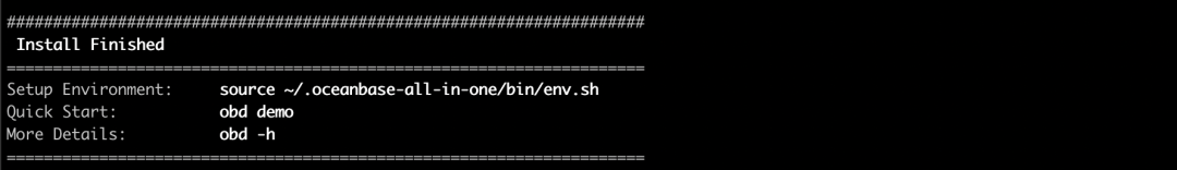 安装完成之后,会在屏幕上输出接下来可以使用的一些命令,第一步需要设置好环境变量,然后可以验证 OBD 命令可用。安装 oceanbase-all-in-one 可以参考以下视频:点击👆播放