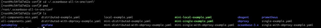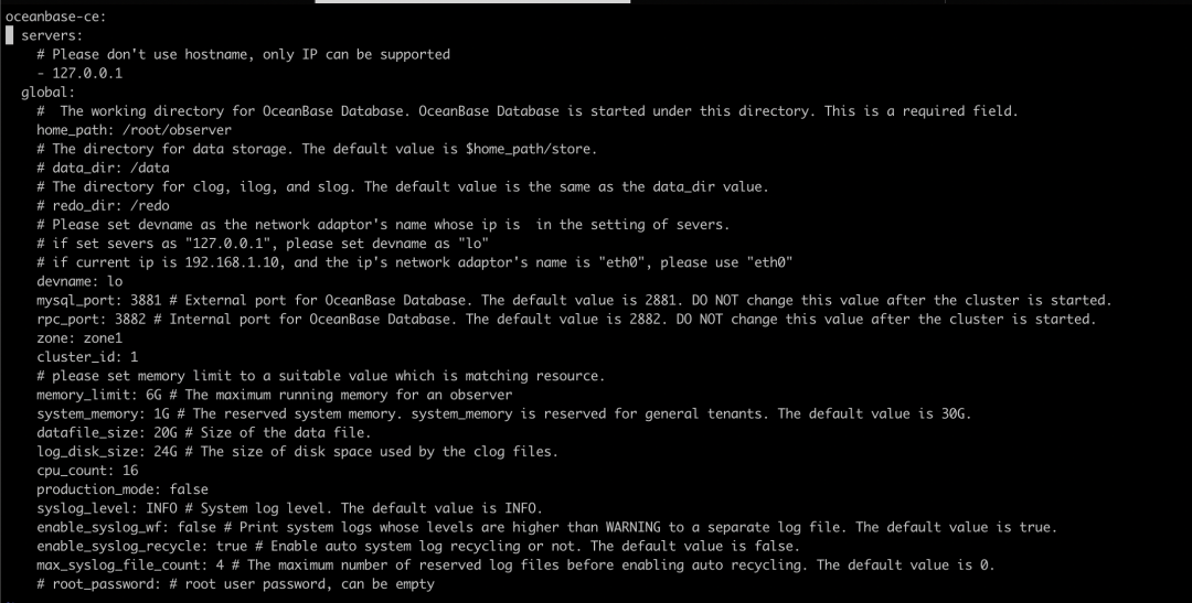 OBD 提供了各种场景的配置文件样例,可以以此作为基础按照真实的环境来进行配置 。oceanbase-all-in-one 安装完成之后,在安装路径的 conf 目录,或者 OBD 的安装目录的 example 目录下有配置文件的样例,本地单节点集群的配置样例为 mini-local-example.yaml,首先复制一份配置文件,然后将配置文件中的 mysql_port, rpc_port 分别修改为3881, 3882。obd cluster deploy test -c test.yaml
