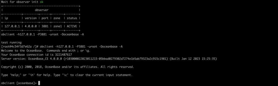 docker exec -it oceanbase-ce ob-mysql test # 使用 test 账号