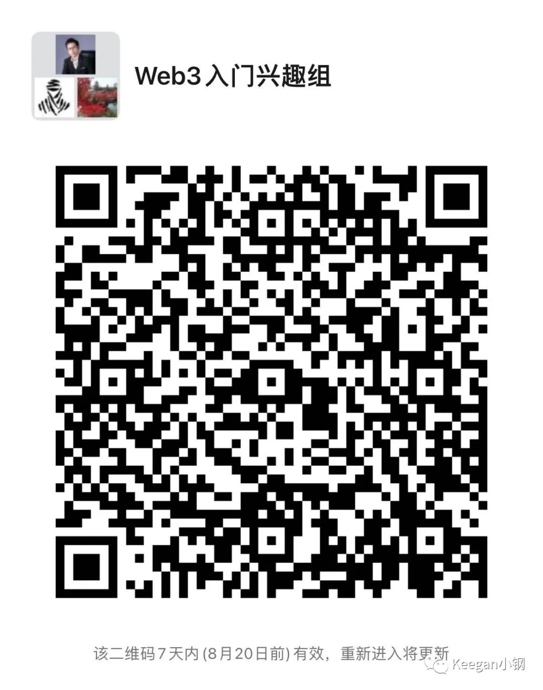 最后,我建了一个微信群,有兴趣深入了解的可以扫码进群,也可以加我微信(keegan704),找我拉入群。加我微信时,请备注「Web3课程」。