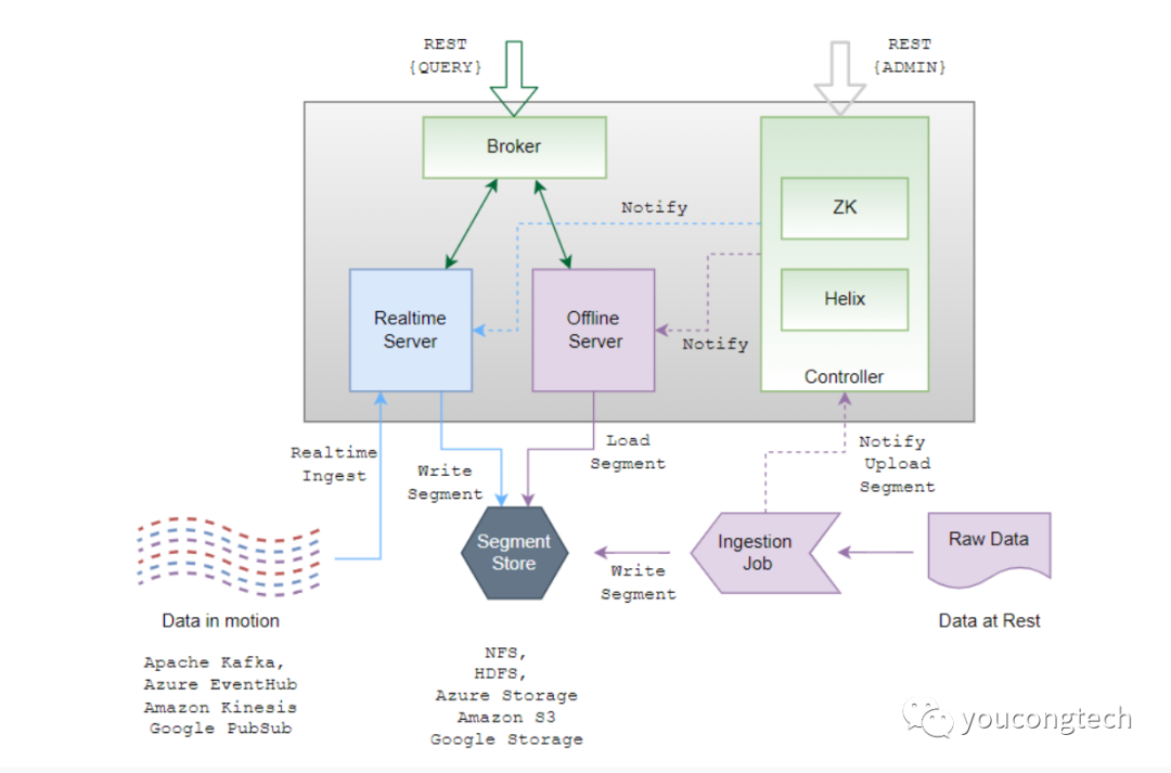 该系统的核心是一个柱状存储,使用了一些智能索引和预聚合技术以实现低延迟。这使得Pinot最适合面向用户的实时分析。同时,Pinot也是其他分析用例的一个很好的选择,比如内部仪表板、异常检测和临时数据探索。