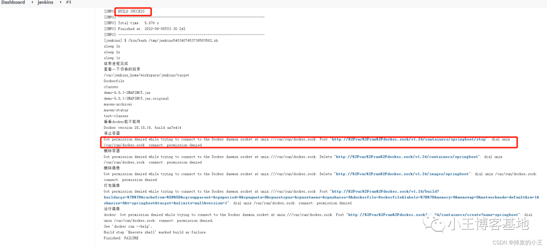 我们看到打包成功了,就是在使用docker命令的时候出现权限问题,这是我们要给docker.sock权限就可以解决了!!