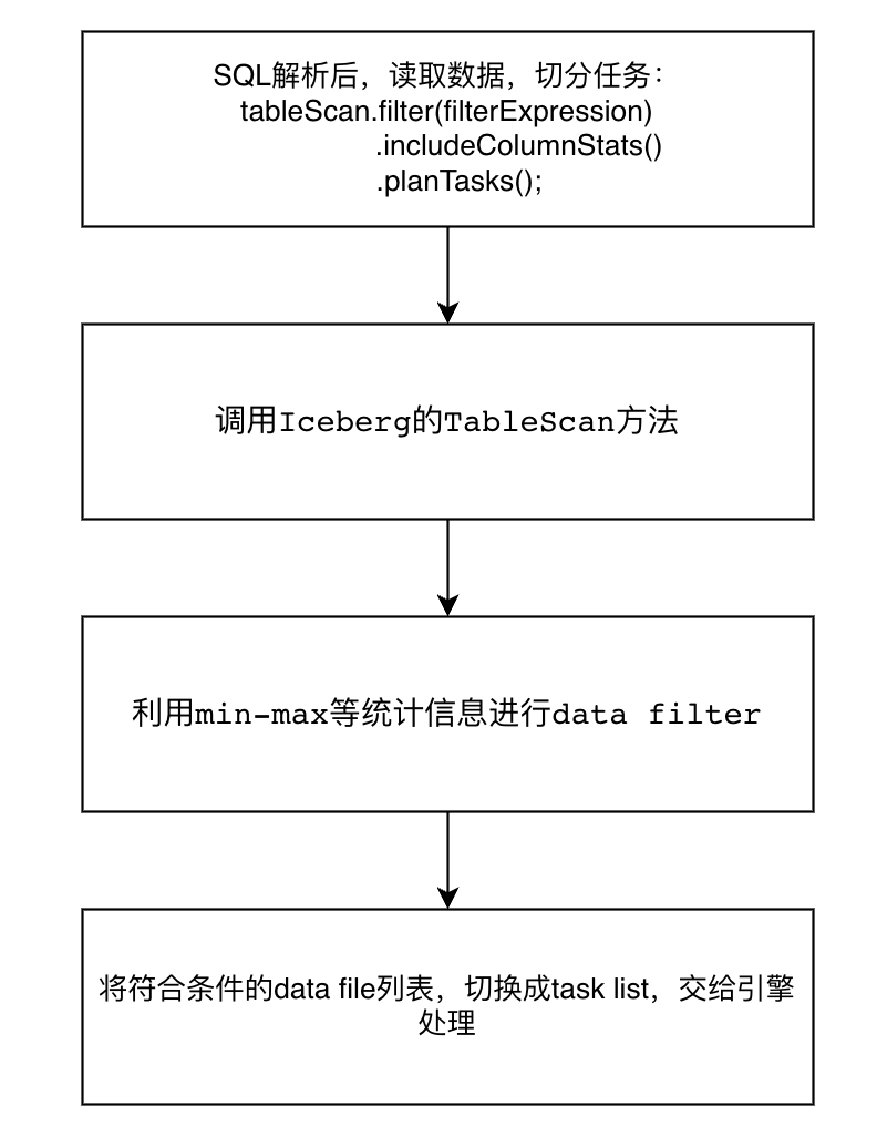 Spark、Presto、Flink 等多种引擎读取 Iceberg 的数据,就是利用分层的元数据找到 data file 列表。例如,Spark 引擎解析 SQL 语句,然后调用 Iceberg 的接口,获取 data file 并进行 task 切分。