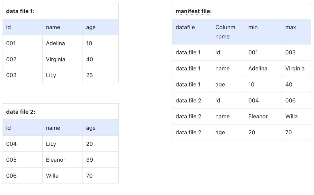 既然 Iceberg 已经提供 data file 级别的过滤。为什么我们还需要引入索引呢?以下面例子进行介绍,左边两个表格分别是 data file 文件里面的内容,右边表格是 data file 对应的 manifest file。