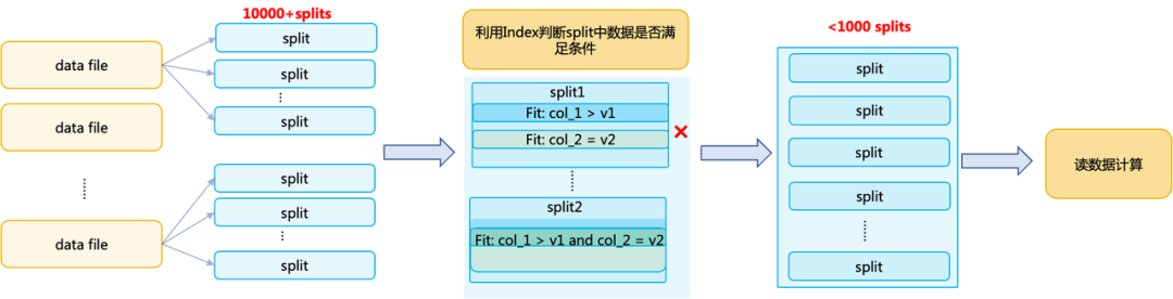 SQL 语句解析后,将符合条件的 data file 列表进行切分后,得到很多 split 的列表。利用索引,分析 split 中数据是否满足条件,如果不满足则跳过。如上图 data file 列表切分后,得到数万级别数量的 split 列表。将索引数据作用在 split1,发现 split1 中没有同时col_1> v1 AND col_2 = v2