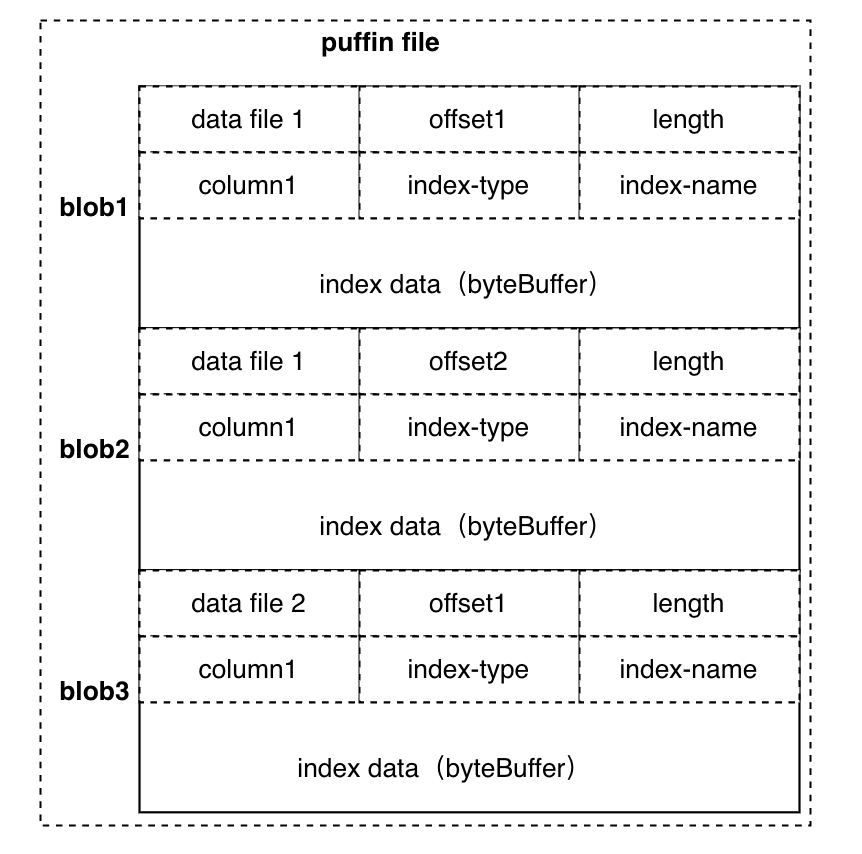 索引文件格式采用[puffin]https://iceberg.apache.org/puffin-spec/格式,这是一种二进制格式。 Magic Blob₁ Blob₂ ... Blobₙ Footer