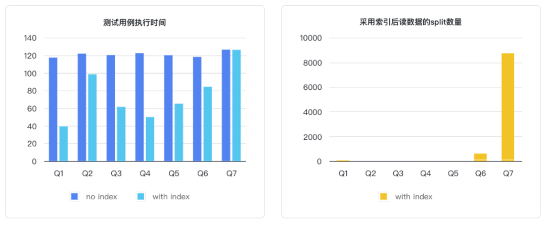 左图展示了 7 条 SQL 语句分别在没有 Index 和采用 Index 情况下的执行时间。右图展示采用 Index 后,7 条 SQL 语句读数据的 split 数量。很明显读数据的 split 数量越少,Index 效果越好。最糟糕的情况,所有的 split 都参数计算,这时和没有构建索引的效果类似。