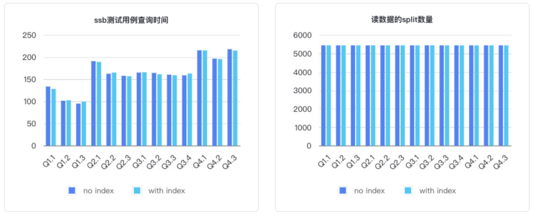 由于 SSB 提供的测试场景,和 Range-Encoded 有利的场景,不太匹配,所以 Index 的效果并没有明显的效果。但也不会比不采用 Index 的效果差。如下面左图,分别是构建索引前后,SQL 语句的执行时间,构建索引的优势并没有体现出来。右图中,可以看到所有的 split 都参与了计算。