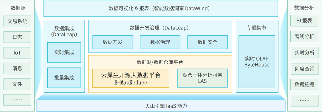 数据中台的大数据生产、服务体系,数据来源于交易系统、日志、IoT、消息、文件等,通过数据集成进入到数据湖中,然后经过数据开发、治理过程,进入到专题集市,最后通过数据分析平台提供给数据的最终用户,包括 BI 报表、离线分析、实时分析、即席查询、数据挖掘等。以上是用户搭建大数据体系的一条完整的数据链路。在这条数据链路上的各个环节都有火山引擎数据中台的产品来对接。火山引擎 EMR 产品在数据中台整个的产品体系全景图中,处于基座的位置(如上图中黄色框所示),对于用户构建端到端的数据链路起着重要的支撑作用。火山引擎 EMR 基于火山引擎的 IaaS 能力,提供底层基础的大数据体系的计算引擎和存储引擎,并向上对接数据开发治理工具 DataLeap。