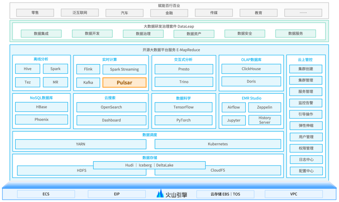 火山引擎是字节跳动的企业服务品牌,主要面向 To B 业务场景。火山引擎中 Stateless 云原生开源大数据平台 E-MapReduce(简称 EMR)为用户提供了云上的端到端的大数据解决方案。与此同时,Apache Pulsar 的一个十分重要的特性也是云原生。先进的存算分离的架构使其非常适合在云化的环境中部署、运维,而 Topic 数据的存储方式也使其扩容操作大为简化,不需要数据的 rebalance 过程。于是,将 Pulsar 集成到火山引擎 EMR 的生态系统中便是一件水到渠成且极具价值的事情。