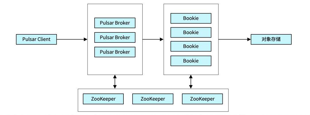 此外,Pulsar Client 与 Pulsar Broker 进行对接。ZooKeeper 节点与 Broker、Bookie 交互,处理元数据以及分布式系统中的协调。