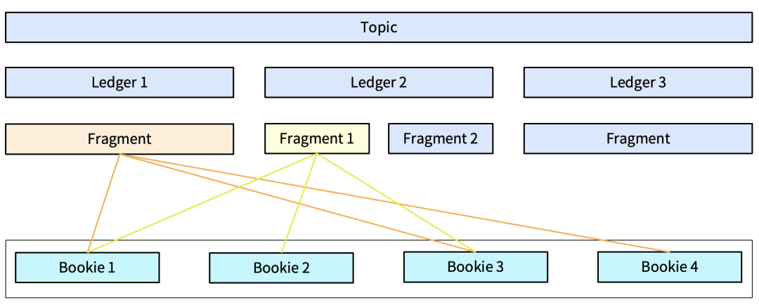 一个 Topic 下会有多个 Ledger,一个 Ledger 下面会有一个或多个 Fragment,每一个 Fragment 下面会有多条消息(多个 Entry)。每个 Fragment 的实际数据的存储位置是在一组 Bookie 上面,不同的 Fragment 对应的 Bookie 的集合都是不一样的。这样的一个结构使得每一个 Topic 的消息天然分布在不同的 Bookie 节点中,而不同的 Fragment 的数据存储在不同的 Bookie 集合中。