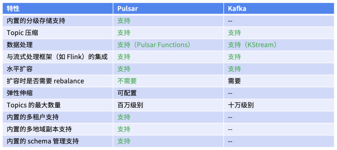 相比于其他消息队列组件,Pulsar 也提供了一些差异化价值。下面这张表对比了 Pulsar 与 Kafka 的部分特性。