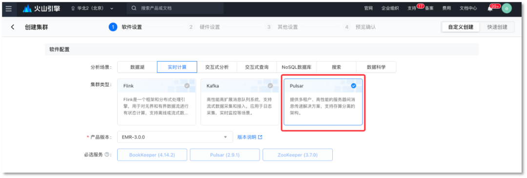 接下来的几张截图展示了火山引擎 EMR 中创建和使用 Pulsar 集群类型的场景。