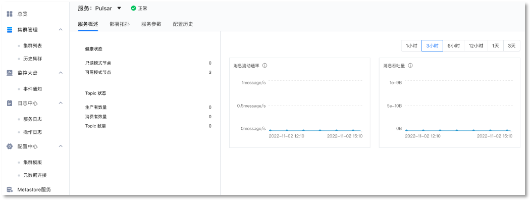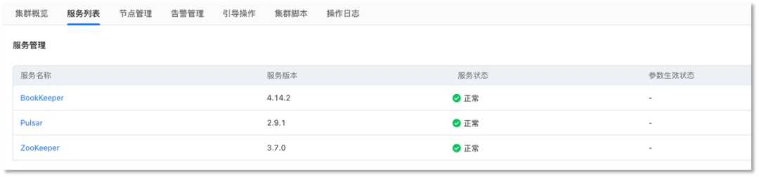 包含 BookKeeper、Pulsar、ZooKeeper 服务,用户可以白屏化运维,例如服务的启停、服务的基本信息查看等: