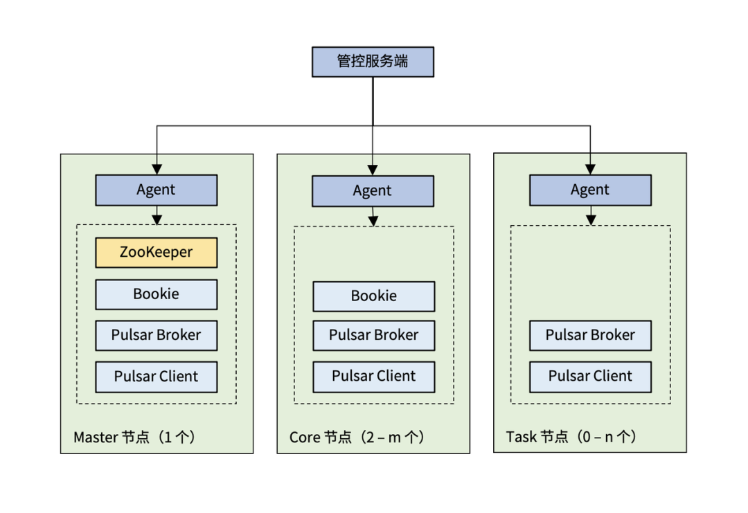 镜像制作与手动拉起:将 Pulsar 安装包集成进 EMR 镜像,建立一个既有类型的 EMR 集群,手动部署 / 运行 ZooKeeper, BookKeeper, Pulsar (Broker)。 自动化部署代码编写:将手动部署的逻辑转化为集群内的 Agent 调用的自动化部署代码,并考虑异常情况处理。 管控服务端:管控服务端配置元数据,以在控制台增加 Pulsar 集群类型相关内容,并驱动管控通用底座调用上一步编写好的自动化部署代码。 参数:Pulsar 参数支持用户可配置 / 系统动态生成。 监控、告警、日志的对接。