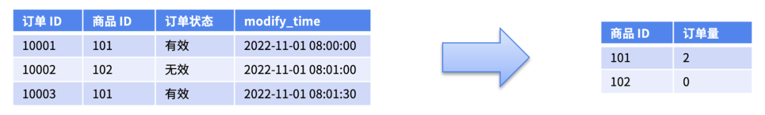 上图左边是业务库中订单粒度的原始表,我们期望聚合成右边的以商品为粒度的商品总订单数的统计表。