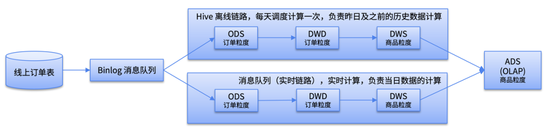 同时维护离线、实时链路,链路复杂,资源消耗大,维护成本高。 对于部分订单状态发生变化的情况,难以很好处理。例如历史订单在当日(今日)发生了失效,状态从有效变为了无效,这时处理起来会有一些复杂性,需要考虑对离线历史数据的实时调整。 离线计算和实时计算结果需要 merge,需要精确把握时间点,离线和实时的计算结果的时间范围需要做到不重、不漏。 对于需要从多个源表获取数据,且多个源表的字段值有可能发生变化的情况,则更为复杂。这里限于篇幅,不展开讲了。感兴趣的读者可以构造一些情况来推演一下相关的处理逻辑,会发现里面确实会有许多复杂的情况,涉及到流 join、数据的消费顺序等。可以梳理一下其中遇到的问题。