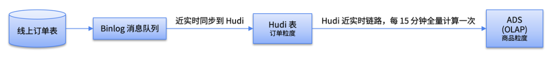 除了 Lambda 架构,还有另一个方案基于 upsert 离线表(如 Hudi 表)的计算。其核心思想是在 Hudi 表中近实时同步业务库中的数据(通过消费 binlog 数据),在 Hudi 表(相当于一个订单粒度的近实时表)的基础上,每隔一段时间(如 15 分钟)按照离线链路聚合数据的方式全量计算一次聚合结果,并将生成的结果同步到 OLAP 引擎中供查询。聚合计算的源头 Hudi 表是近实时更新的,聚合计算过程是近实时触发的,因此 OLAP 引擎中的结果表的时效性也是近实时的。这个方案的数据处理链路如下图所示: