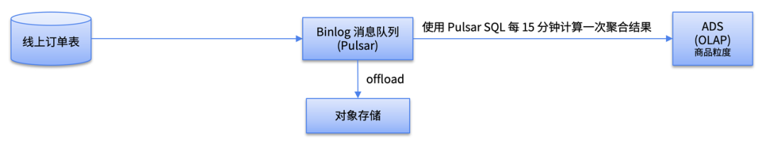 针对以上实时数仓的场景, Pulsar 具备解决方案。具体来说,线上业务库的订单表输出 binlog 到 Pulsar 消息队列中。这个消息队列有全量的数据,其中冷数据可以 offload 到对象存储中。接下来可以使用 Pulsar SQL 每 15 分钟针对 Pulsar 中的全量数据计算一次聚合结果,并将计算结果写入 OLAP 引擎中供查询。这个方案类似于上面提到的 Hudi 方案,不同之处在于利用了 Pulsar SQL,相当于可以直接去查询消息队列中存储的数据。