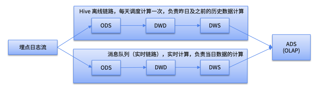 一个经典方案,类似于上文提到的 Lambda 架构,需要维护离线和实时两套数据链路,如下图所示: