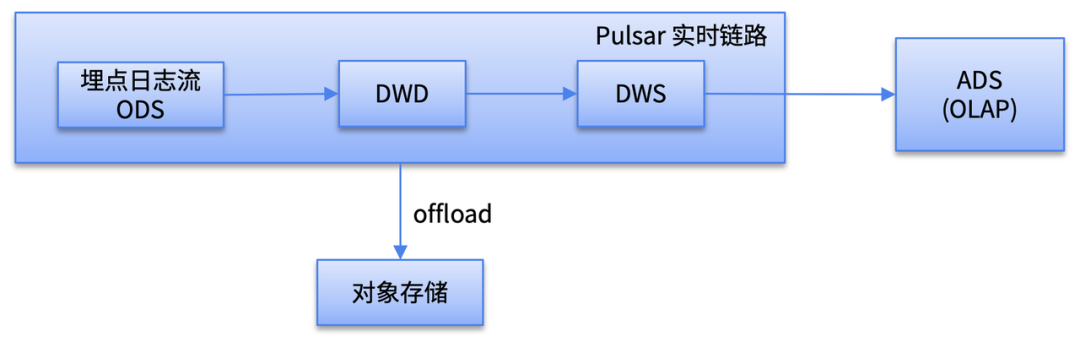 而基于 Pulsar 也可以有一类方案,聚焦在实时链路。埋点日志数据上报到 Pulsar 中,用实时任务去写下游的 DWD 和 DWS 层(到 Pulsar 中)。整个 Pulsar 的实时链路也支持数据 offload 到对象存储。数据也可以直接写到 OLAP 层。如果有离线数据计算的需求,可以用 Pulsar SQL 直接对接 Pulsar 中存储的数据。整个数据链路如下图所示: