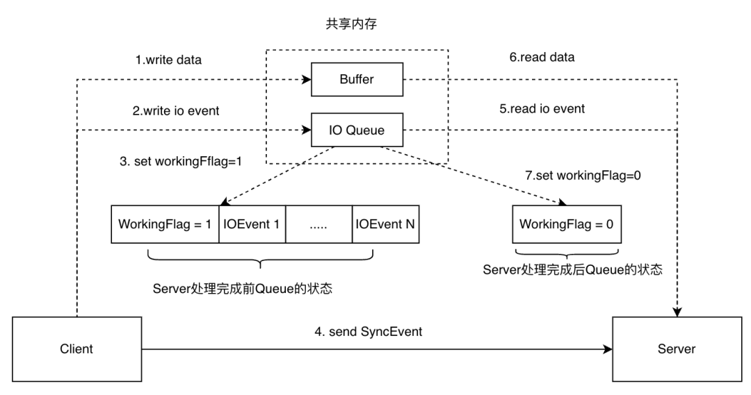 在线场景中按需实时同步,每次数据写入都需要进行一次进行进程同步(下图中的4),虽然延迟问题解决了,但在性能上,需要交互的数据包需要大于一个比较大的阈值,零拷贝带来的收益才能突显。因此在共享内存中构造了一个 IO 队列的来完成批量收割 IO,使其在小包 IO 密集场景也能显现收益。核心思想是:当一个进程把请求写入 IO队列后,会给另外一个进程发通知来处理。那么在下一个请求进来时(对应下图中的 IOEvent 2~N,一个 IOEvent 可以独立描述一个请求在共享内存中的位置),如果对端进程还在处理 IO 队列中的请求,那么就不必进行通知。因此,IO越密集,批处理效果就越好。
