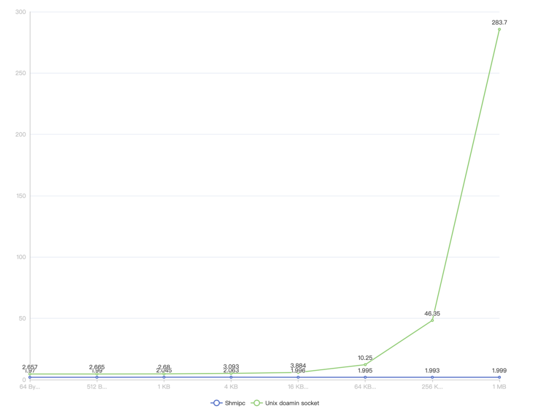 其中X 轴为数据包大小,Y轴为一次 Ping-Pong 的耗时,单位为微秒,越小越好。可以看到在小包场景下,Shmipc 相对于 unix domain socket 也能获得一些收益,并且随着包大小越大性能越好。